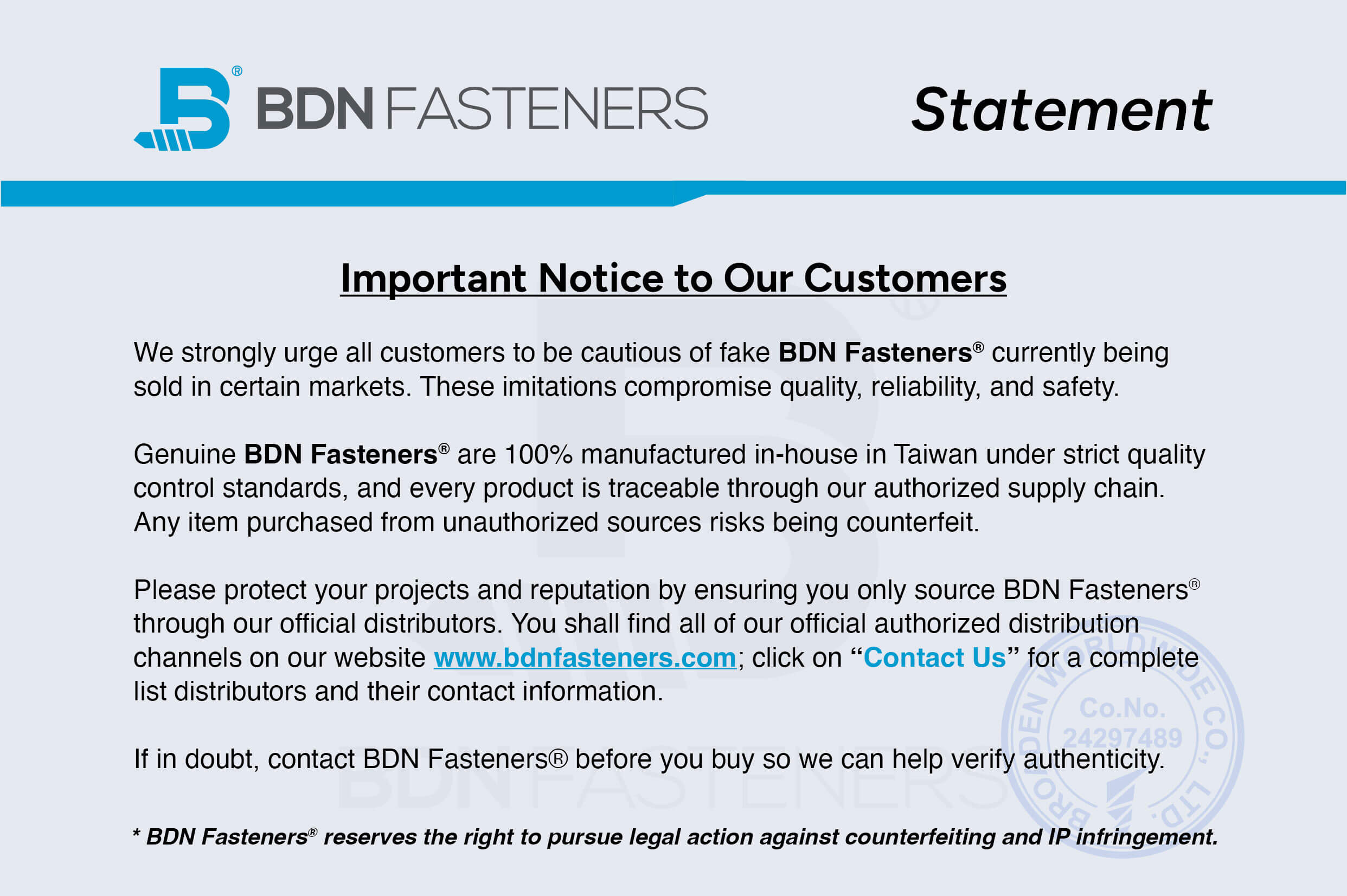 BDN Fasteners® reserves the right to pursue legal action against counterfeiting and IP infringement.